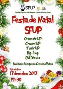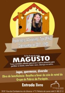 Como já vem sendo tradição, vamos comemorar o nosso magusto no dia 12 de novembro, na SFUP. Às 15 horas, o grupo de teatro infantil Teatr’UP kids apresenta a peça “A Carochinha”. Em seguida vamos todos conviver, assar castanhas e chouriços, participar nos jogos, comprar rifas na quermesse… Apareça no nosso magusto que costuma ser sempre divertido! Pode trazer: castanhas talhadas para assar, frutos secos, chouriços, … Se quiser participar na nossa obra de beneficência: este ano, vamos apoiar a